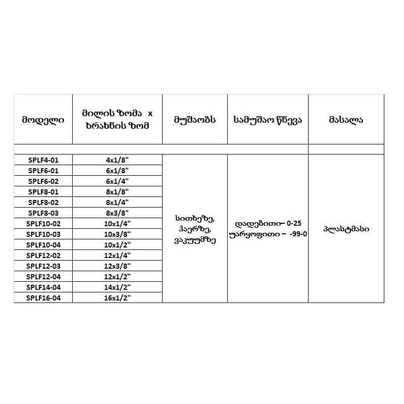 ფიტინგი SPLF განკუთვნილია მილების გადასაბმელად და უზრუნველყოფს ჰერმეტულ, გამძლე შეერთებას პნევმატურ სისტემებში. ფართოდ გამოიყენება დანადგარებში, მანქანებში და პნევმო ინსტრუმენტებთან, სადაც აუცილებელია მაღალი სანდოობა და ეფექტური მუშაობა.
